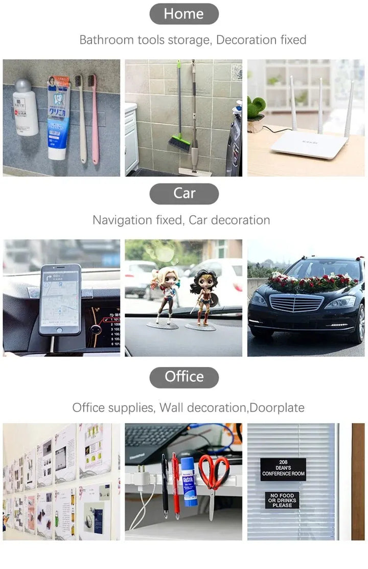 ⑥ Vielseitig einsetzbar: Verwenden Sie es zum Befestigen oder Aufkleben von Gegenständen wie Bilderwänden, Handyhalterungen fürs Auto, Wandaufklebern, Haken, Klebepads, Handyhüllen und so weiter.